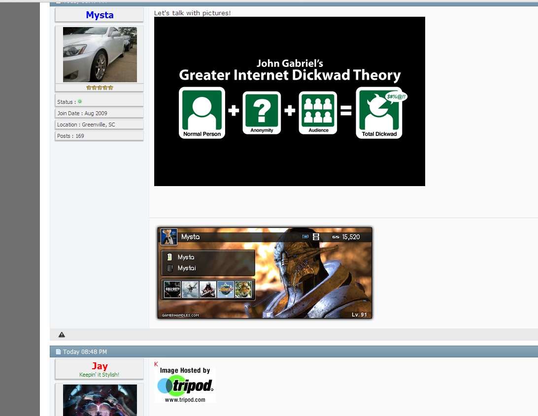 Casey I'M A GAY SON! Senior Member Joined Nov 10, 2003 Posts 2,960 Feb 9, 2011 #63 Looks to me like Jay has a strong personality, and Mysta was butthurt by it.